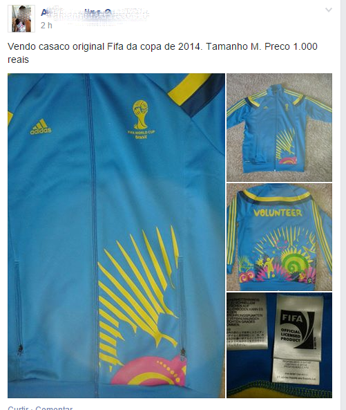 Tenta vender o casaquinho que ganhou para trabalhar de voluntária na Copa 2014 FIFA por nada mais nada menos que R$ 1.000. Onde? NO MERCADÃO PONTA GROSSA!