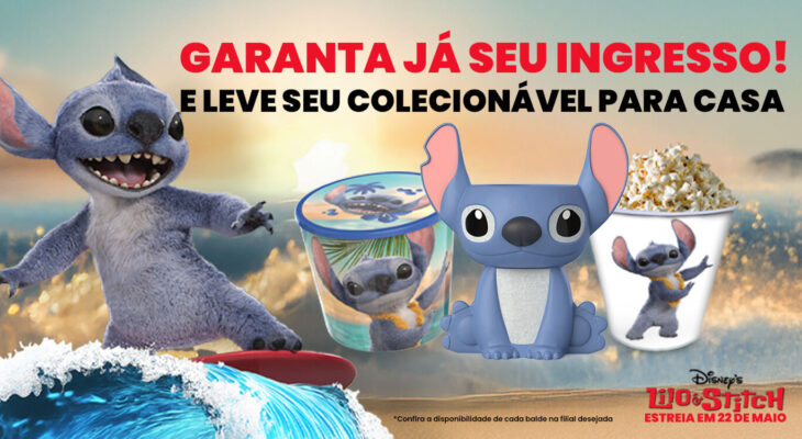 O Cine Araújo preparou uma linha especial de baldes de pipoca inspirados no live-action de Lilo & Stitch, que chega aos cinemas nesta quinta, dia 22 de maio.