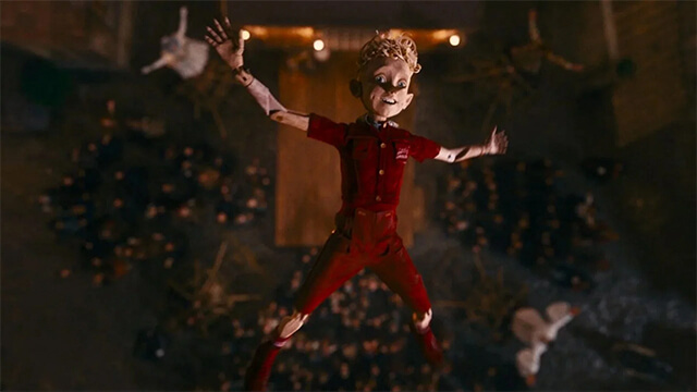 É nesse momento que surge Pinóquio (Vitaliya Kornienko), a partir de um tronco que começa a se mexer dentro do armário, dando origem a um boneco que ganha vida de forma quase espontânea, e aqui o filme já apresenta uma de suas propostas mais interessantes, que é a forma diferente de contar a origem do personagem, fugindo um pouco do tradicional, mas ainda mantendo o núcleo emocional da relação entre pai e filho. Gepeto aceita Pinóquio imediatamente, o que causa uma certa estranheza, já que sua reação parece quase exageradamente natural diante de algo completamente fora do comum, o que pode soar um pouco desconfortável, mas também reforça a intensidade do desejo que ele carregava.
