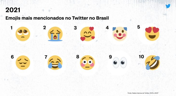 No Twitter, os emojis são vistos nas mais diversas conversas sobre o que está acontecendo. Em homenagem a esta data, a plataforma compartilha quais foram as figurinhas mais utilizadas no Brasil em 2021 até o momento – entre 1o de janeiro e 15 de julho.