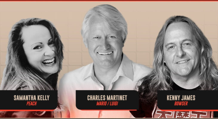 Charles Martinet (Mario, Luigi e Wario) estará acompanhado de Samantha Kelly (Princesa Peach e Toad) e Kenny James (Bowser).
