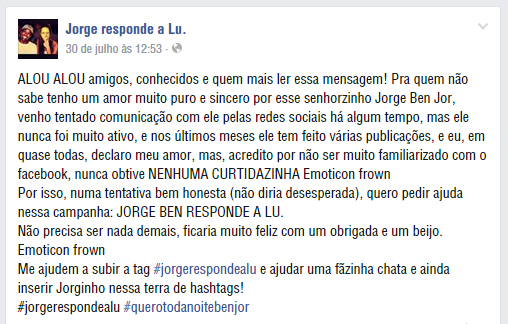 A Luise é uma fã alucinada pelo Jorge Ben e criou a campanha para conseguir uma simples resposta do cantor! Quer ajudar? É só usar a hashtag #Jorgerespondealu nas redes sociais e curtir a página.