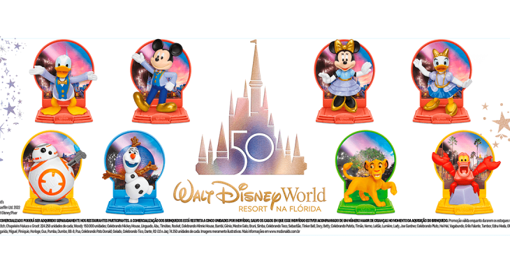 Em janeiro, os fãs de Disney podem comemorar os 50 anos do Walt Disney World no McLanche Feliz com uma das mais aguardadas campanhas já lançadas. Serão 50 brinquedos que trazem os queridos personagens do universo Disney, entre eles Mickey e seus amigos, além dos personagens de clássicos como Rei Leão, Procurando o Nemo, Frozen, Os Incríveis, Star Wars, entre outros.